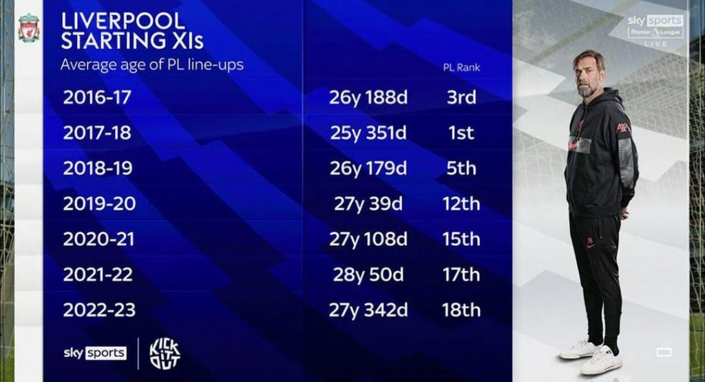 At the end of the 2022/23 season, Liverpool were ranked 16th when it comes to the average squad age in the Premier League, only ahead of Man City, West Ham, Tottenham, and Fulham.